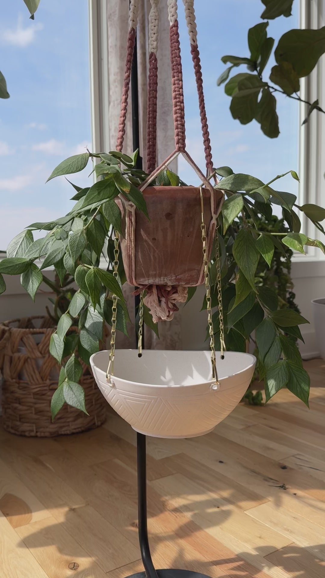 Here is where this hanging catch tray becomes the handiest plant essential. It simply hangs from any 4"-9" planter and catches ALL of the drainage. When the plant has been watered, it can be removed, emptied, and placed on the next plant. If watering is done for the day, simply leave it hanging! The stunning design will look like an intentional piece of plant decor amongst the rest of your planty jungle.